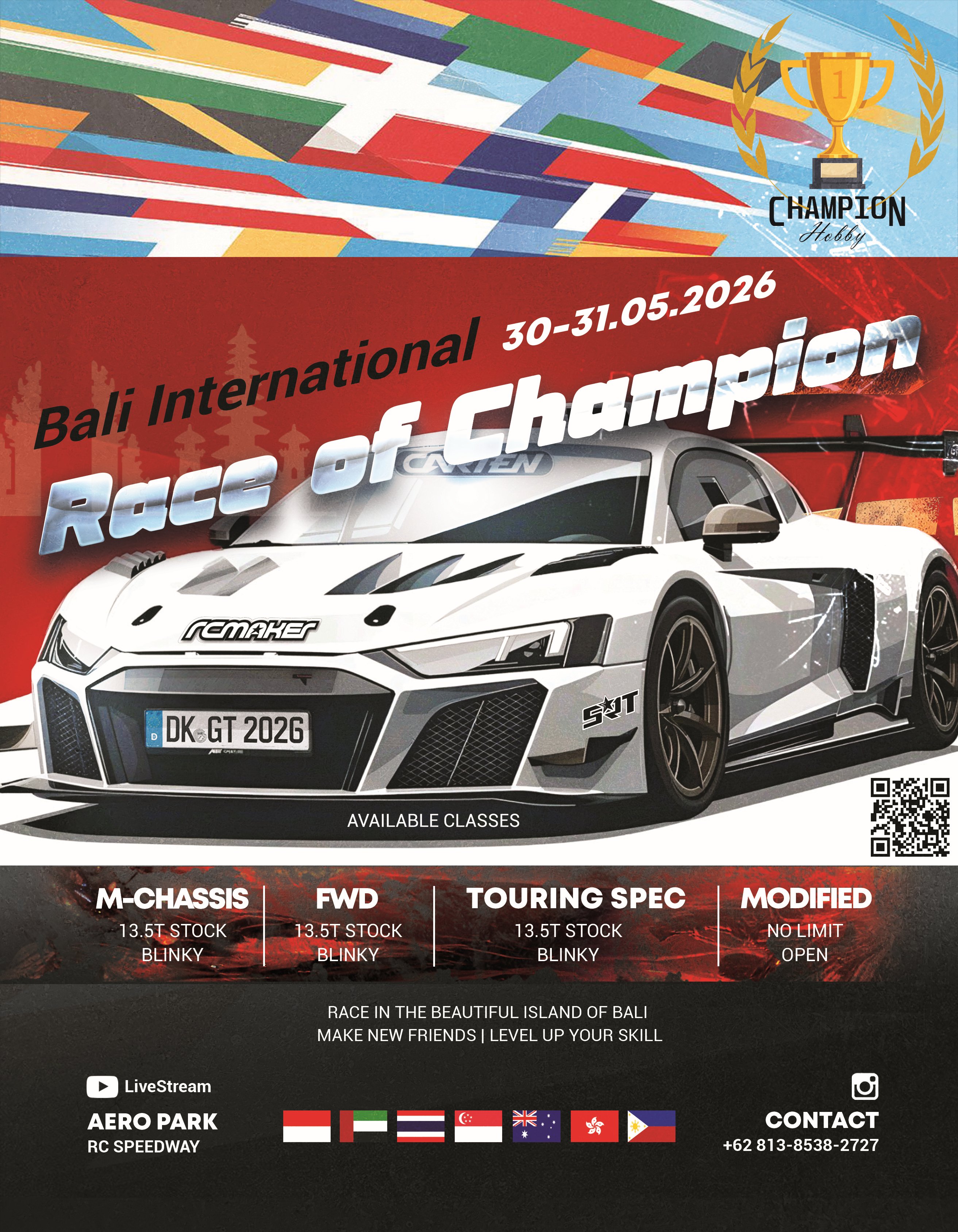Bali, Indonesia – Get ready for the roar of brushless motors against the backdrop of paradise. Champion Hobby is thrilled to announce the Bali International Race of Champion, a high-octane radio controlled 1/10 EP touring car event set to take place on May 30th and 31st, 2026, at the beautiful Aero Park Speedway in Keramas beach, Bali. This landmark event invites RC racers from across the globe to compete in one of the world’s most scenic destinations. The Bali International Race of Champion is designed to offer a challenging and fair competition for drivers of all specialties, featuring four distinct race categories that emphasize both driving skill and technical setup.